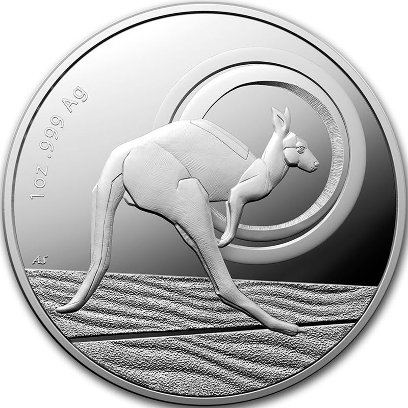 Изображение культовой фигуры кенгуру на фоне «геометрического» солнца. Также, здесь обозначен вес и чистота металла — 1 oz .999 Ag