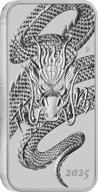 На реверсе изображен рычащий дракон с раскрытыми лапами. Вверху слева: LB (инициалы дизайнера Lucas Bowers), справа: Р монограмма Пертского монетного двора. Внизу справа: 2025 (год чеканки).