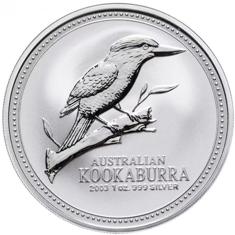 На реверсе изображена кукабарра, сидящая на ветке эвкалипта. В основании ветки инициалы дизайнера LK (Louis Kwan). Внизу надпись в три строки: AUSTRALIAN KOOKABURRA 2003 1 oz. 999 SILVER (кукабарра, год чеканки, вес и проба серебра).