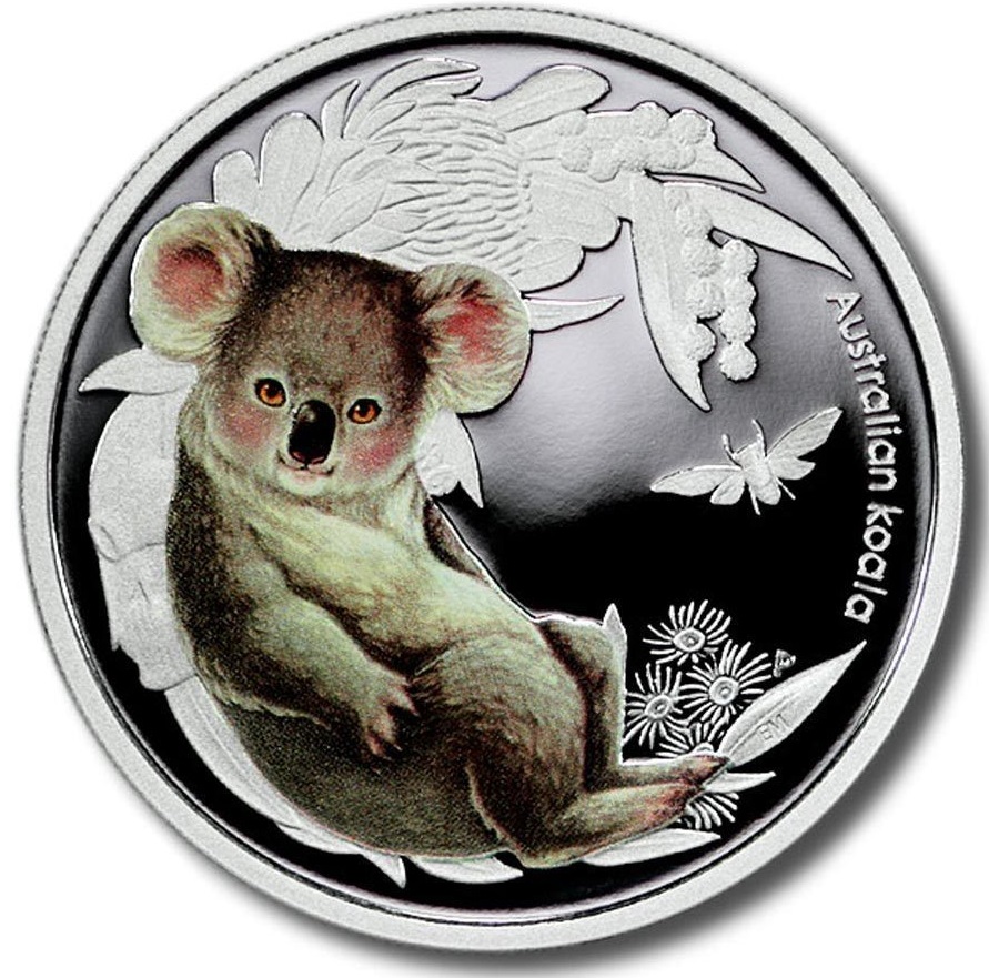 Изображенный в цвете малыш коала на фоне местных цветов и листвы. Название монеты: Australian koala