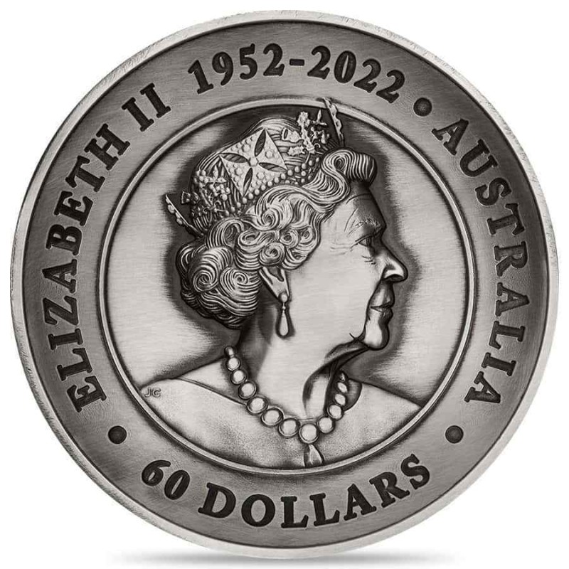 На аверсе монеты изображена фигура Ее Величества Королевы Елизаветы II и надписи: "ELIZABETH II" - имя королевы, "1952-2022" - период правления, "AUSTRALIA" - страна-эмитент и "60 DOLLARS" - номинал.