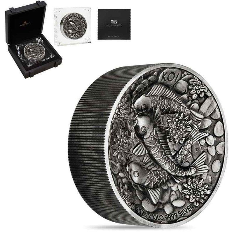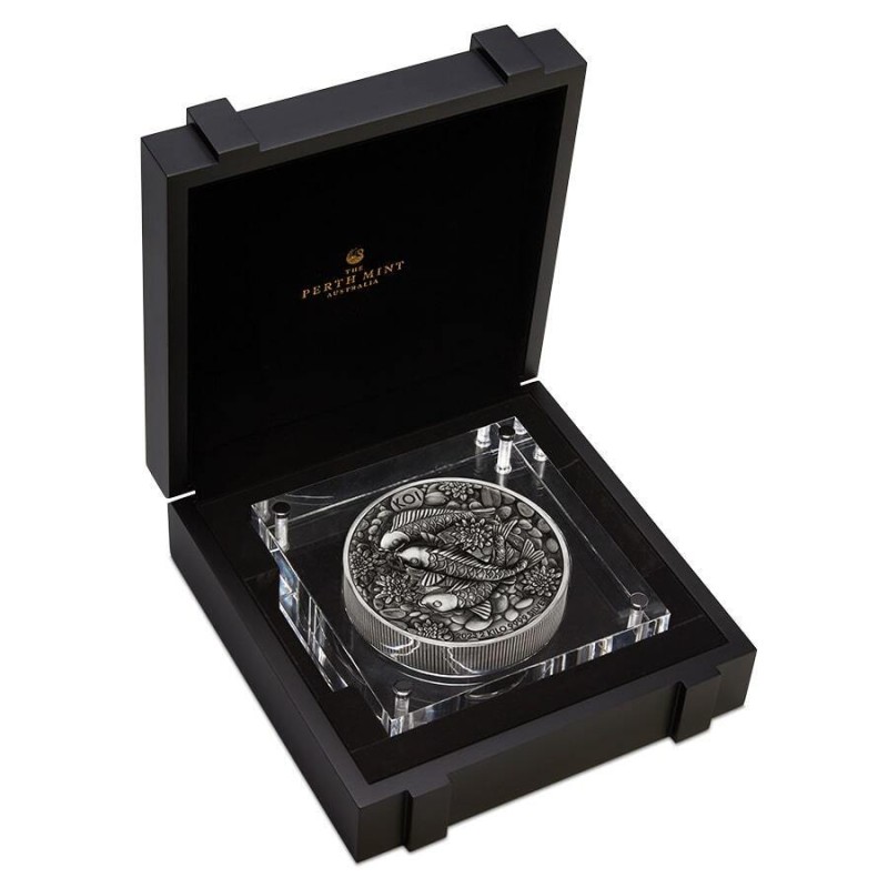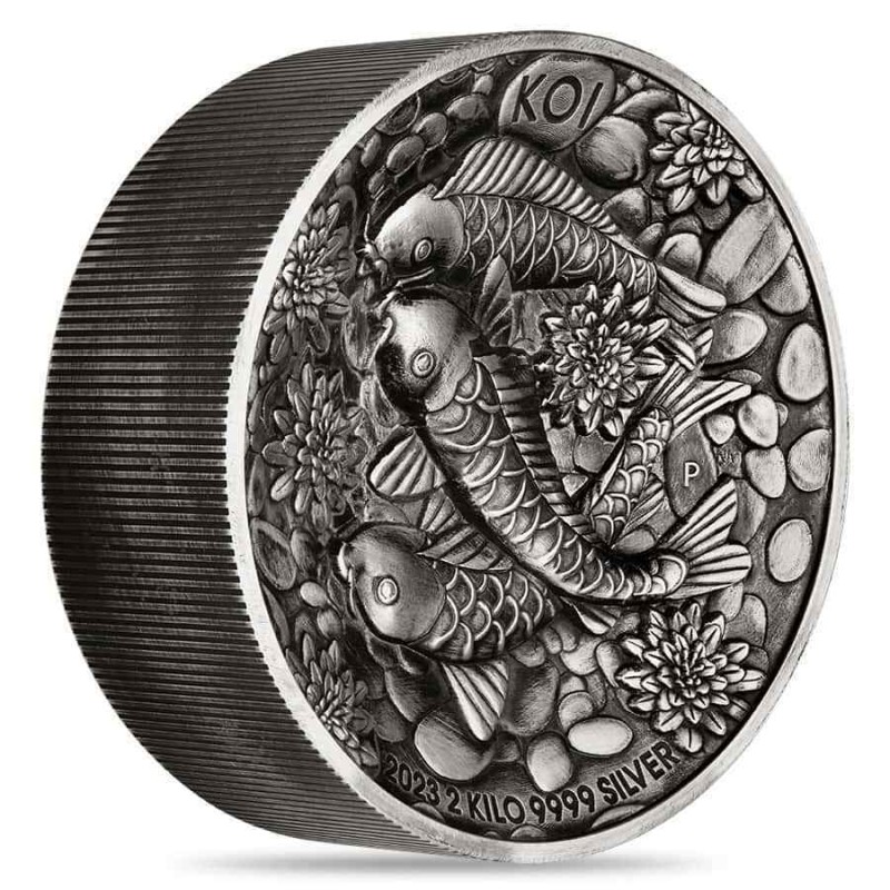 Серебряная монета Австралии "Рыбки Кои" 2023 г.в. (высокий рельеф), 2000 г чистого серебра (Проба 0,999)