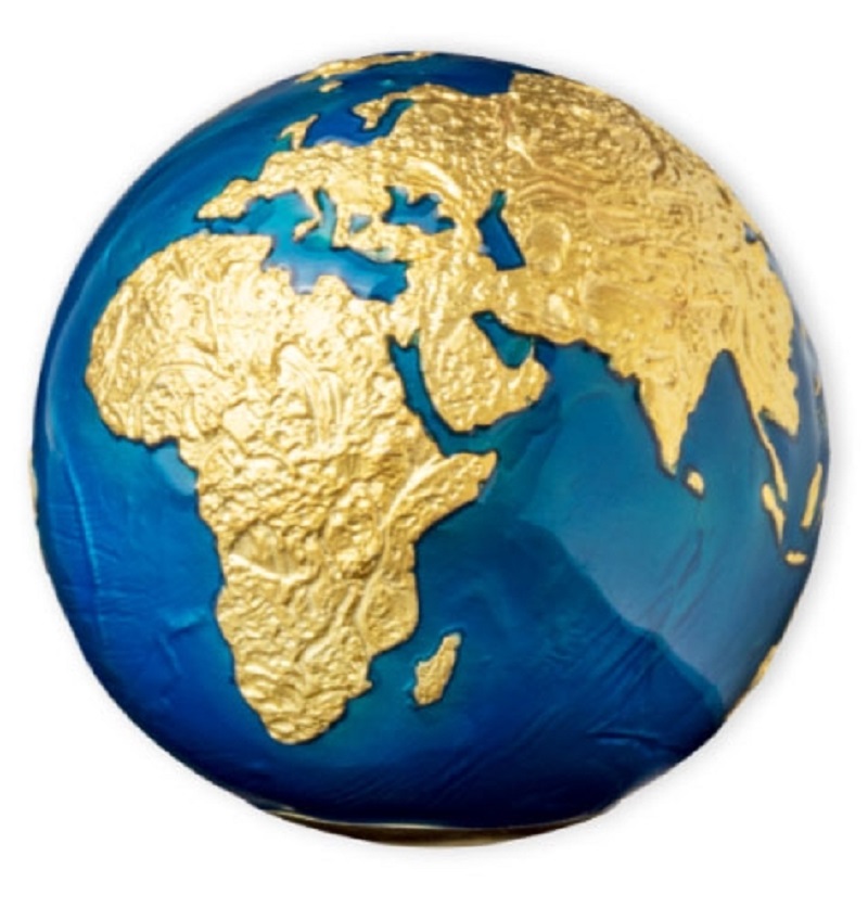 Эта красивая серебряная монета весом в 3 унции посвящена нашей драгоценной планете - Земле, с выборочным золотым покрытием. У монеты чудесная сферическая форма, она выполнена с полупрозрачной синей эмалью и водным принтом. Монета поставляется в роскошном футляре вместе с сертификатом подлинности. Ограниченный тираж до 999 штук по всему миру.