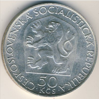На аверсе герб Чехословакии и надпись по кругу: "CESKOSLOVENSKÁ SOCIALISTICKÁ REPUBLIKA 50 KCS" (Чехословацкая социалистическая республика 50 крон).