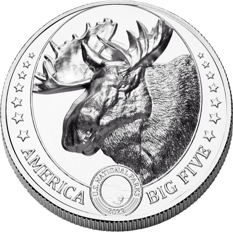 На реверсе изображена голова лося. Вокруг стилизованный узор из звездочек и надпись: AMERICA BIG FIVE U.S. NATIONAL PARKS 2023 (серия, национальные парки США, год чеканки).