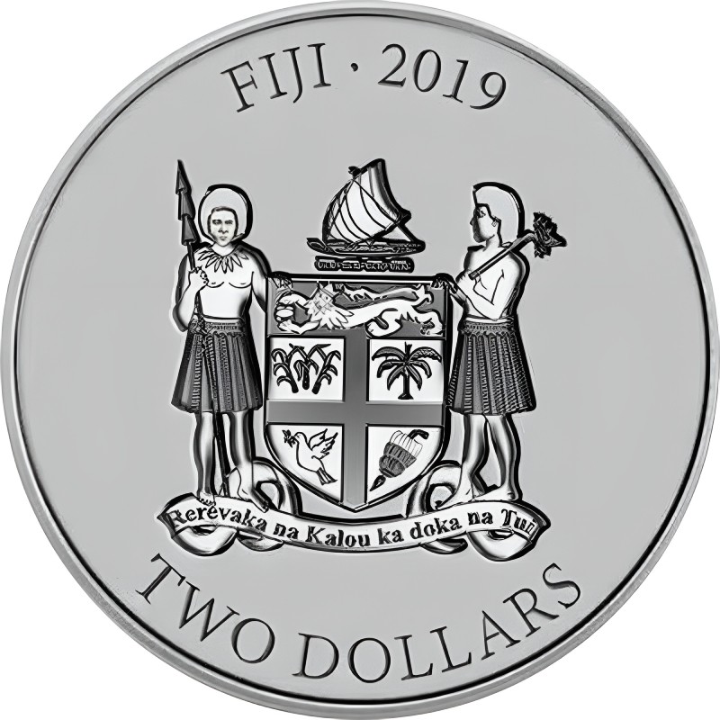 В центре расположен герб Фиджи: геральдический щит, который с двух сторон держат два фиджийских воина, одетые в традиционные юбки из тапы. Левый воин держит копье, правый — дубину-тотокиа. Над щитом расположено изображение традиционного фиджийского каноэ-такиа с парусом. Под щитом на ленте надпись: Rerevaka na Kalou ka doka na Tui (Бойся Бога и почитай Короля). Над изображением вверху вдоль канта надпись: FIJI 2019 (страна-эмитент и год чеканки), внизу - TWO DOLLARS (номинал).