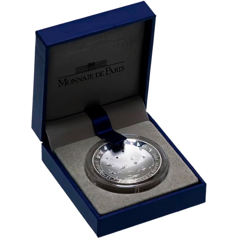 Эта чудесная серебряная монета Парижского монетного двора Франции посвящена Международному году астрономии и 40-летию первой высадки человека на Луну. Монета имеет уникальный выпукло-вогнутый чекан — что придает изображению объем и глубину.