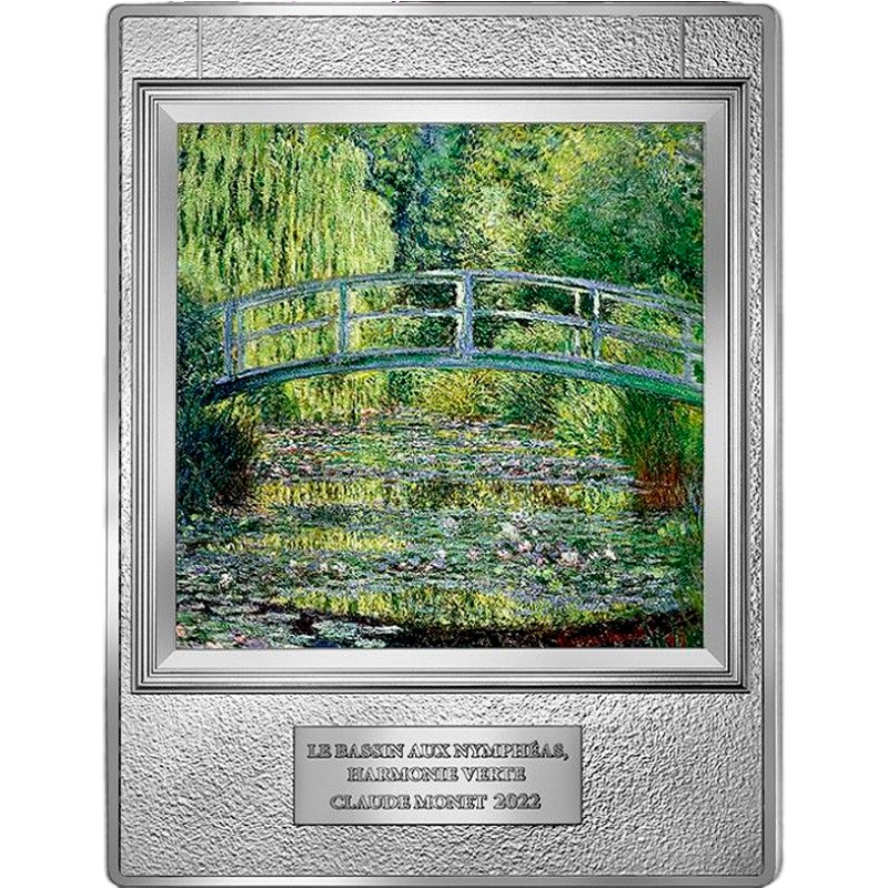 Эта чудесная серебряная монета Парижского монетного двора Франции в форме картины весом 500 грамм и размером 90X69 мм из серии «Шедевры музеев» (Masterpieces of Museum). На ней представлена цветная репродукция полотна Клода Моне «Пруд с кувшинками: Зеленая гармония» (1899).
