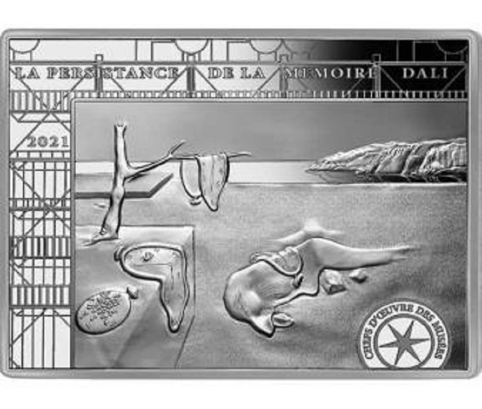 Эта великолепная серебряная монета является частью французской серии «Шедевры музея», посвященной знаменитой работе Дали «Постоянство памяти». У монеты качество Proof, красивый дизайн, она поставляется в футляре вместе с сертификатом подлинности. Ограниченный тираж всего 500 штук по всему миру.