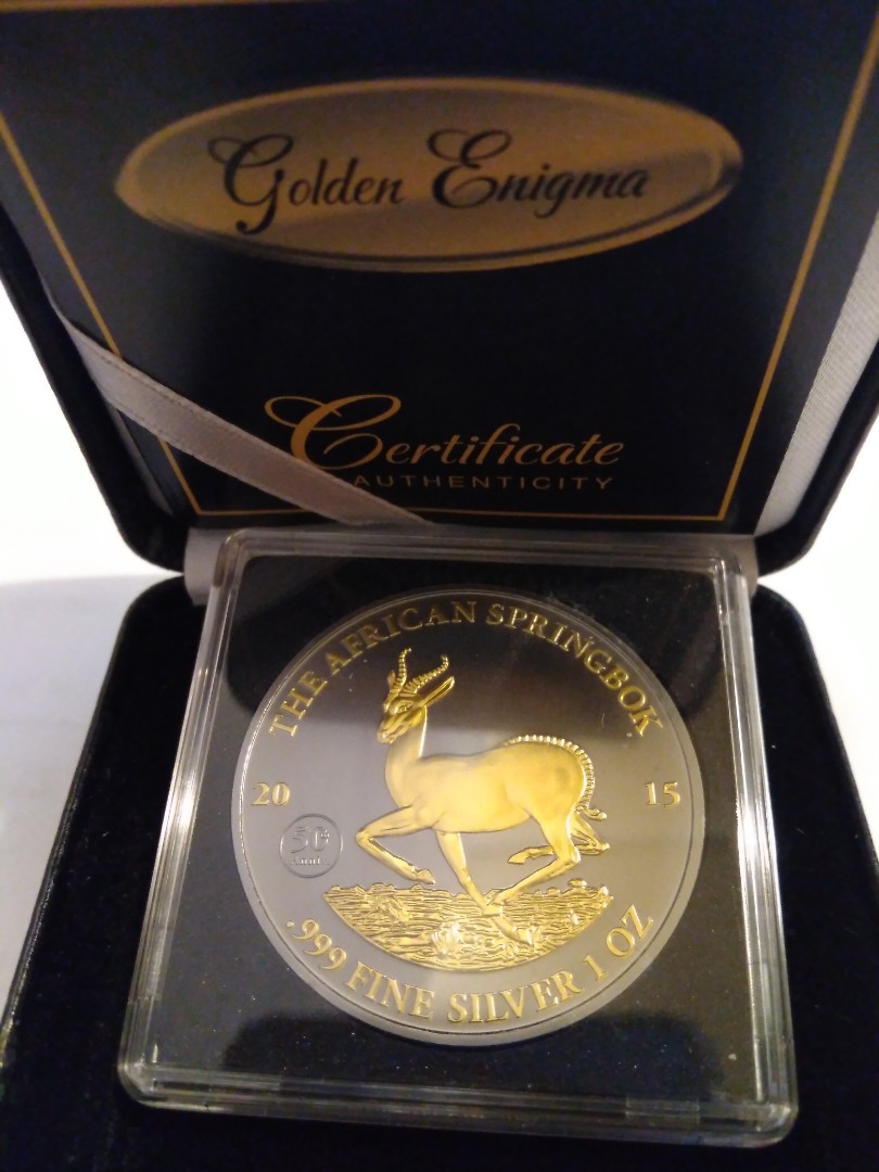 Серебряная монета Габона «Африканская антилопа» с покрытием из рутения и золота 2015 года выпуска является вторым выпуском в серии «Золотая Тайна». Нанесение золотого и рутениевого покрытия происходило в частном монетном дворе Германии. Ограниченный тираж.