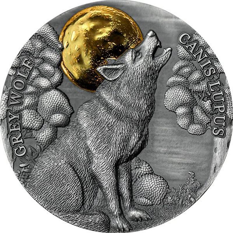 На реверсе изображен волк в лесу. Слева надпись: GREY WOLF (серый волк), справа: CANIS LUPUS. У луны выборочное золочение, чтобы продемонстрировать ее различные текстуры и узоры.