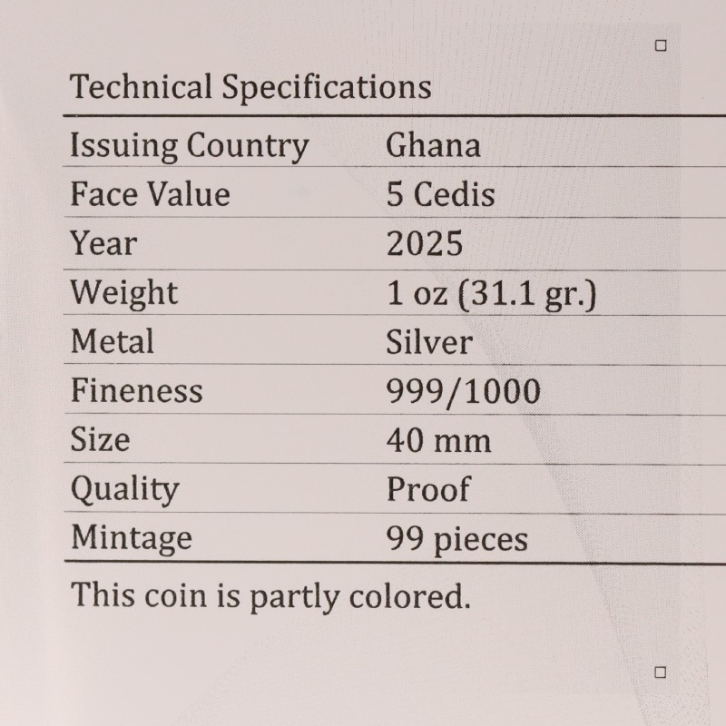 На аверсе монеты изображен государственный герб Ганы с надписями: «REPUBLIC OF GHANA» - страна-эмитент, «FIVE CEDIS» - номинал, «1 OZ.999 FINE SILVER» - вес и проба серебра и «2025» - год выпуска.