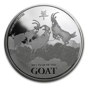 На реверсе монеты изображены гуляющие козы, указан вес и проба серебра в монете - 1 унция чистого серебра (999 пробы), сверху видно изображение китайского иероглифа, внизу - надпись "2015 год - год Козы".
