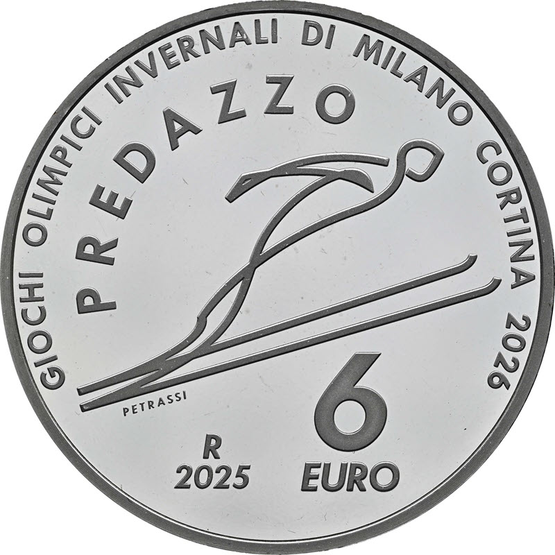 На реверсе изображена пиктограмма прыжков с трамплина. Над пиктограммой надпись: PREDAZZO (место проведения соревнований), внизу: PETRASSI R 2025 6 EURO (инициалы дизайнера Silvia Petrassi, монограмма римского монетного двора, год чеканки, номинал). Вдоль канта надпись: GIOCHI OLIMPICI INVERNALI DI MILANO CORTINA 2026 (игры).