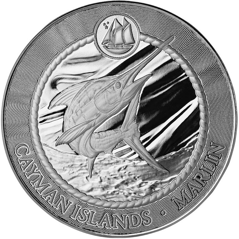 На реверсе изображён марлин, выпрыгивающий из воды. Вверху, в круге, изображен парусник и три звезды герба Каймановых островов. Внизу вдоль канта надпись: CAYMAN ISLANDS · MARLIN (страна-эмитент, марлин).
