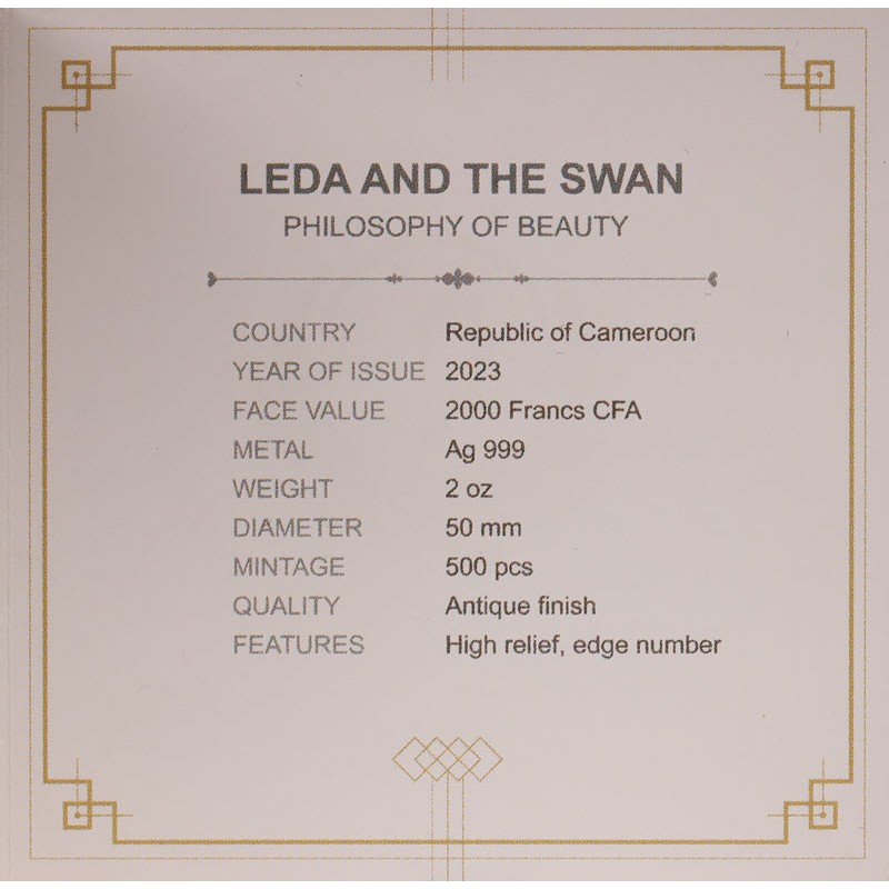 На этой элегантной серебряной монете весом в 2 унции изображен известный миф о Леде, соблазненной лебедем. Монета с пронумерованным краем, античная отделка и поставляется в тематическом футляре вместе с сертификатом подлинности. Ограниченный тираж до 500 штук по всему миру.