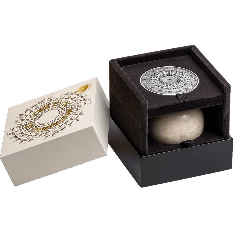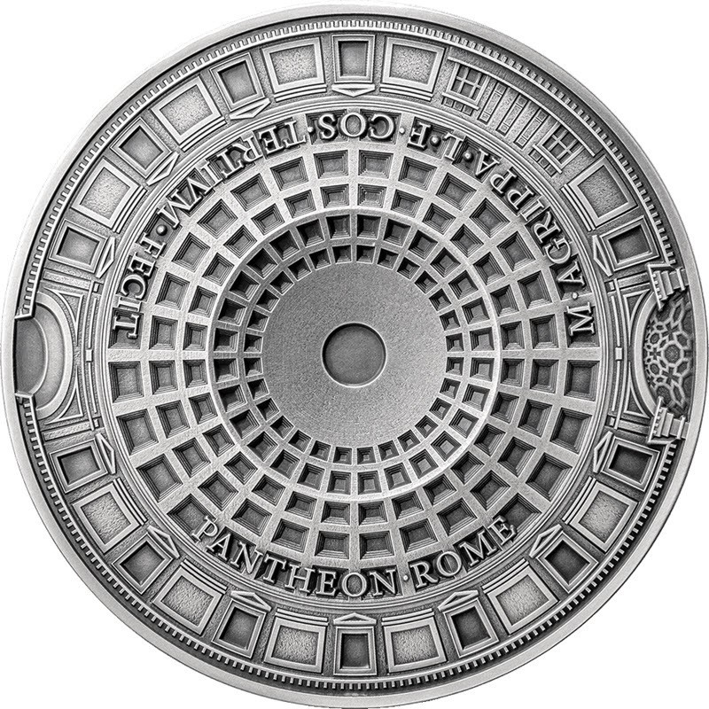 Серебряная монета весом в 5 унций от польского монетного двора MINT XXI. У монеты качество античной отделки, в набор входит мраморная сфера, тщательно воссоздающая каррарский мрамор окулуса Пантеона. Поставляется в оригинальном футляре с сертификатом подлинности. Тираж: 500 штук.