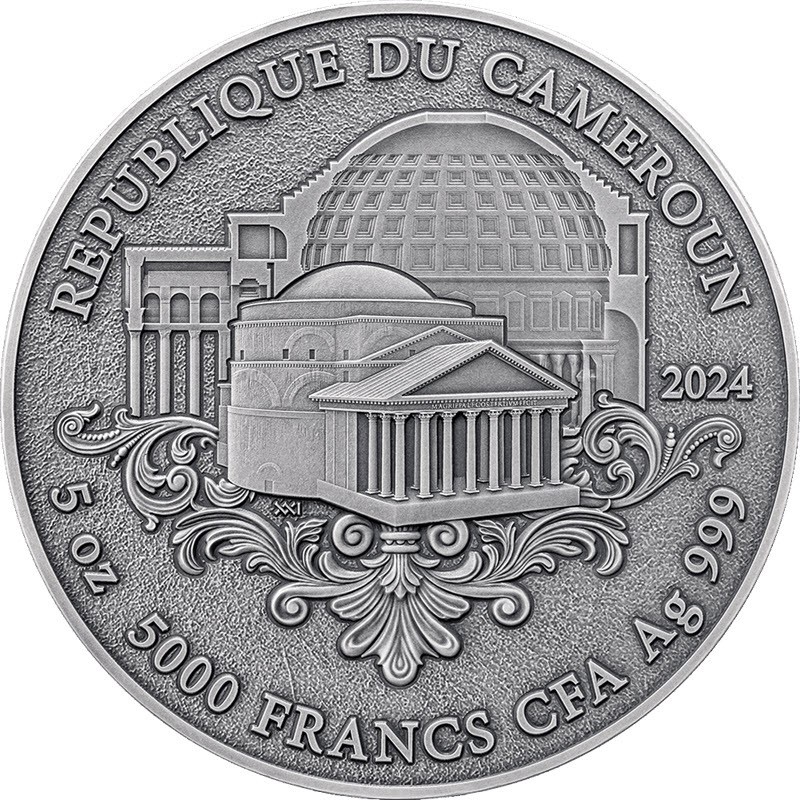 На аверсе изображен римский Пантеон на фоне растительного орнамента. Под зданием: XXI (монограмма польского монетного двора), справа: 2024 (год чеканки). Вдоль канта надпись: REPUBLIQUE DU CAMEROUN 5 OZ 2000 FRANCS CFA Ag 999 (страна-эмитент, вес и проба серебра, номинал). На гурте выгравирован серийный номер монеты.