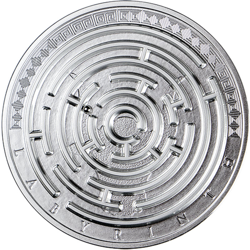 На реверсе монеты представлен замечательный и детализированный лабиринт с маленьким шариком, катящимся по лабиринту. На оборотной стороне внизу надпись: “LABYRINTH” - название монеты.