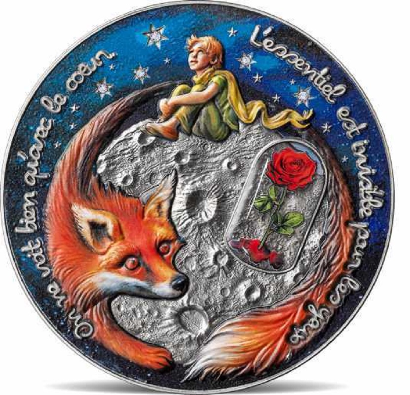 На реверсе монеты изображен Маленький принц на Луне, смотрящий на звезды с бриллиантовыми вставками. Его друг лиса с любовью обвивает планету, а 3D-вставка-роза излучает элегантность.
