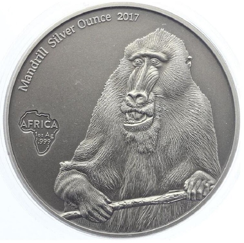 Изображение мандрила (примата из семейства мартышковых), держащий палку. Надпись Mandrill Silver Once 2017. Слева изображение африканского континента.