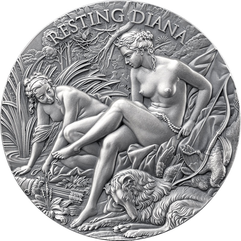 На реверсе интерпретация картины Франсуа Буше «Отдыхающая Диана». Вверху надпись: RESTING DIANA.