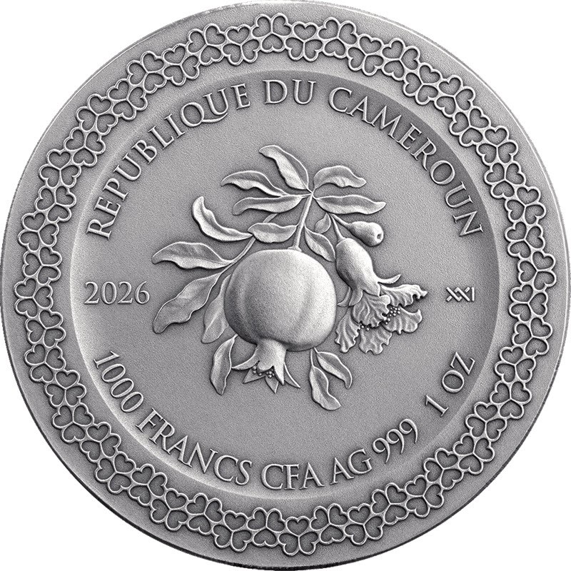 На аверсе в центре изображены плоды граната и листья, символизирующие изобилие и любовь. Слева надпись: 2026 (год чеканки), справа: XXI (монограмма польского монетного двора). Вокруг граната надпись: REPUBLIQUE DU CAMEROUN 1000 FRANCS CFA Ag 999 1 Oz (страна-эмитент, номинал, вес и проба серебра). Вдоль канта орнамент из цветков клевера.