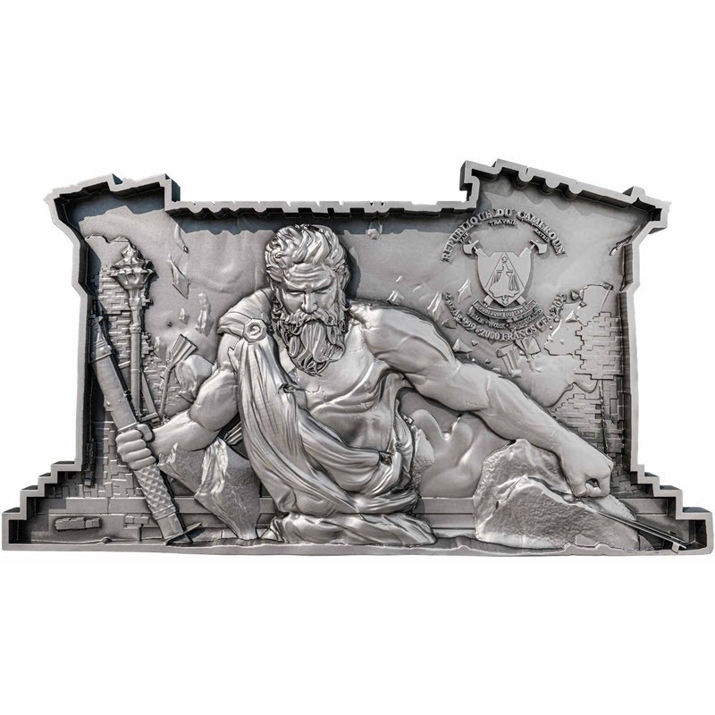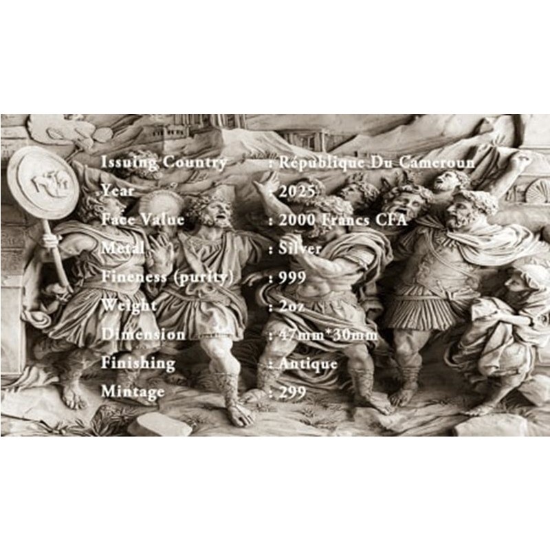 На аверсе изображен Зевс в классическом одеянии с молнией в руке на фоне руин. Справа вверху герб Камеруна. Вокруг герба надпись: REPUBLIQUE DU CAMEROUN 2 oz Ag .999 · 2000 FRANCS CFA · 2025 (страна-эмитент, вес и проба серебра, номинал, год чеканки).