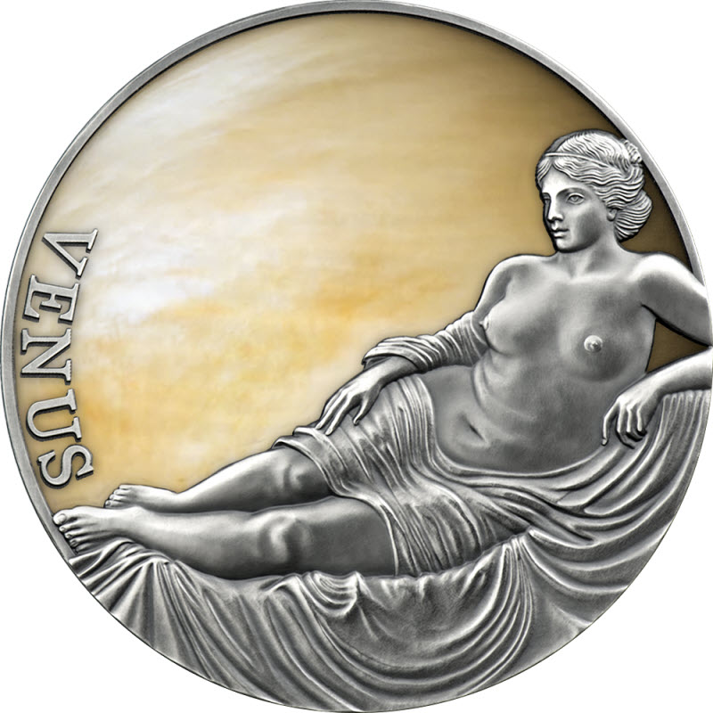 Эта очаровательная монета представляет вторую планету от Солнца, названную в честь римской богини любви и мира. Ограниченный тираж — 500 штук.