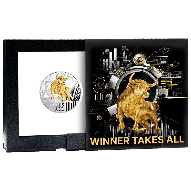 На реверсе изображен бык на фоне графиков и символов валют. Внизу надпись: WINNER TAKES ALL (Победитель получает все).