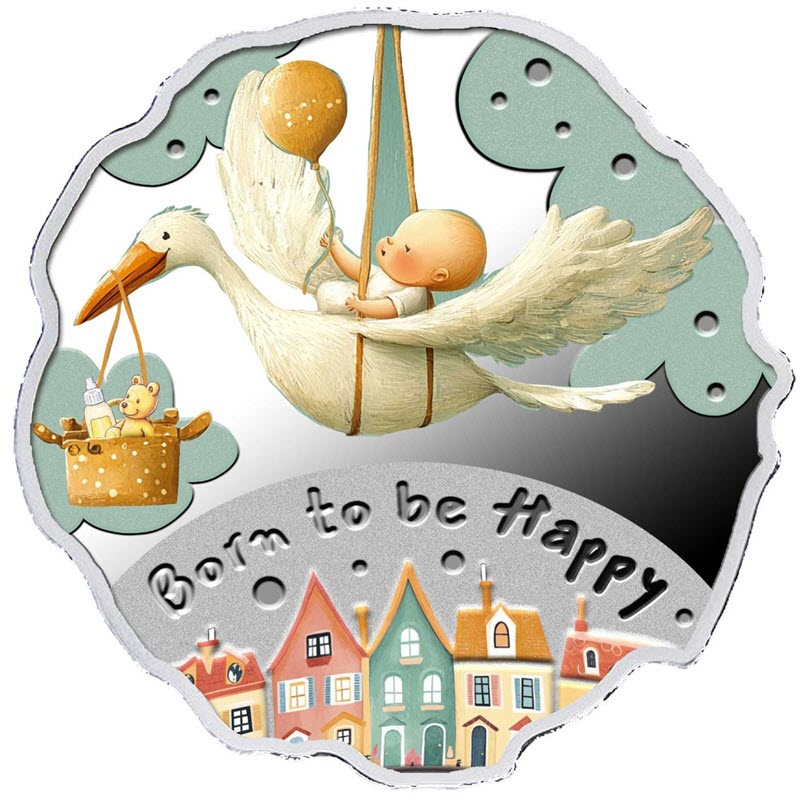 На реверсе изображен аист, несущий младенца с воздушным шаром. Внизу разноцветные домики. Над ними надпись: Born to be Happy (Рождён быть счастливым).