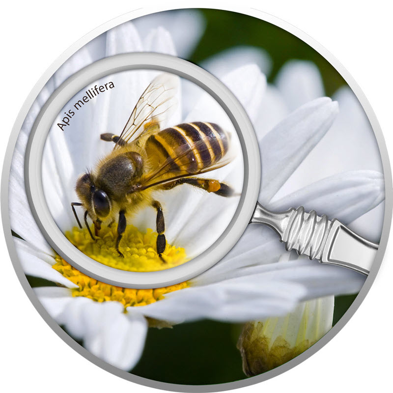 На реверсе монеты изображена чудесная цветная пчела, опыляющая цветок, украшенный миниатюрной лупой и надписью: «Apis mellifera» — научное название пчелы.