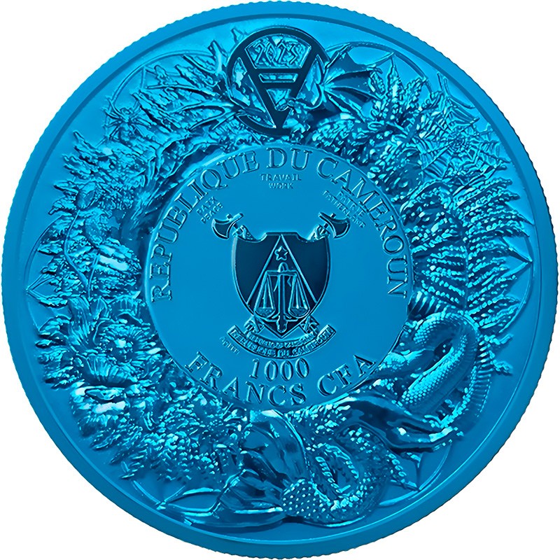 В центре изображен герб Республики Камерун. Вокруг него надписи: REPUBLIQUE DU CAMEROUN 1000 FRANCS CFA Ag 999 (страна-эмитент, номинал, проба серебра). Вверху – древнеславянский символ Велеса с датой чеканки – 2026. В славянской мифологии Велес — бог мудрости, магии и покровитель домашнего скота. Широкий кант украшен сложным орнаментом с растительными мотивами и мифическими существами.