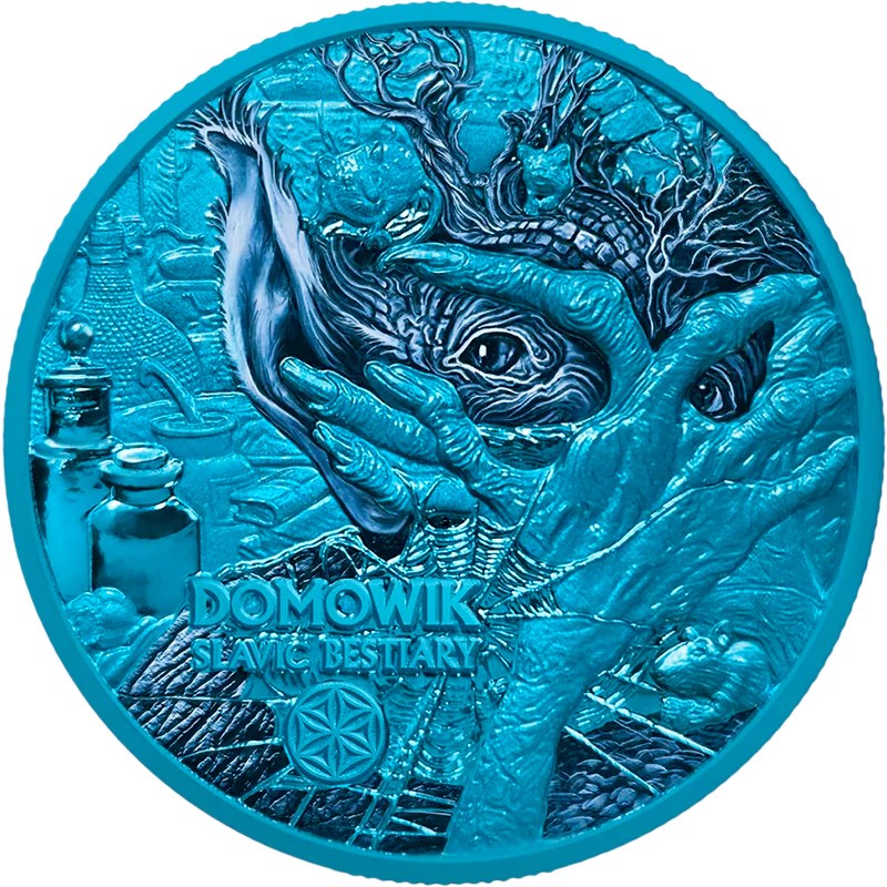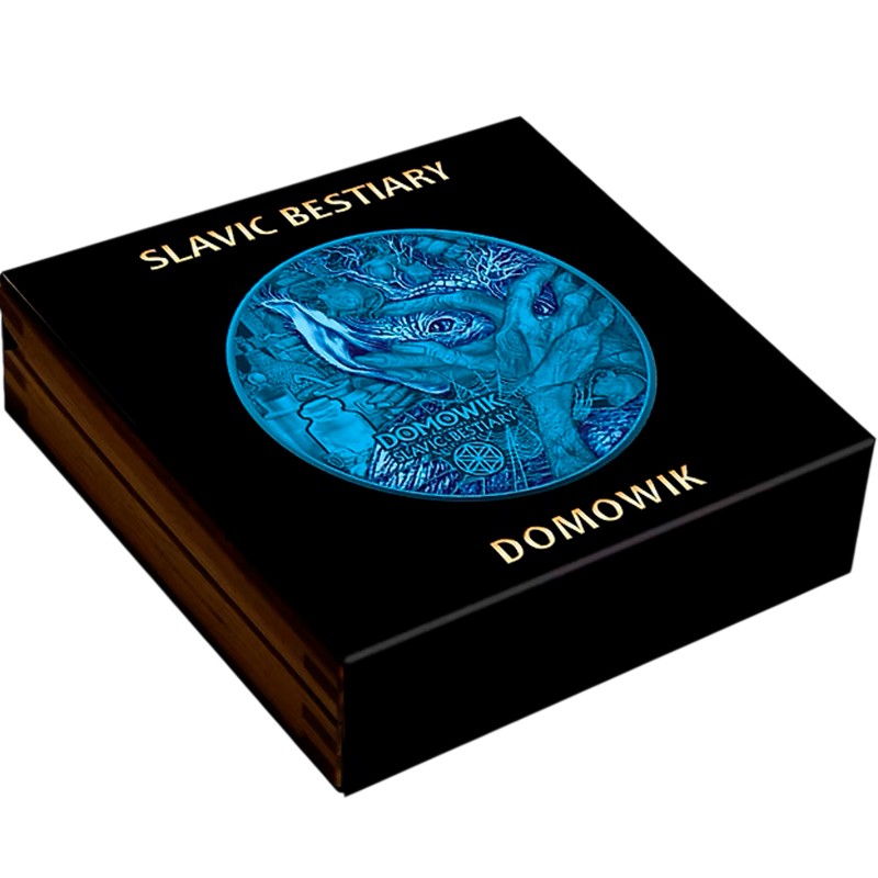 Эта удивительная серебряная монета, весом в 2 унции из серии «Славянский бестиарий» («Slavic Bestiary»). У монеты качество бриллиант анциркулейтед с применением технологии Space Printing Blue (Космический синий), имеет выборочную уф-окраску, благодаря которой под ультрафиолетовым светом проявляются скрытые светящиеся элементы.