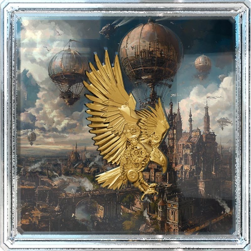 Эта удивительная серебряная монета весом 2 унции из серии «Стимпанк-верность». У нее размер 40 Х 72 мм, красивый горельеф, качество античной отделки и выборочное золочение. Поставляется в футляре с сертификатом подлинности. Тираж: 99 штук.