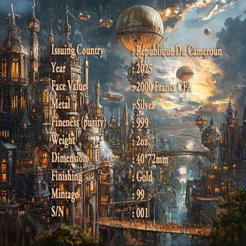 На аверсе на фоне механического орла изображен герб Камеруна. Вокруг герба надпись: REPUBLIQUE DU CAMEROUN 2 OZ Ag 999 2000 FRANCS CFA 2025 (страна-эмитент, вес и проба серебра, номинал, год чеканки).