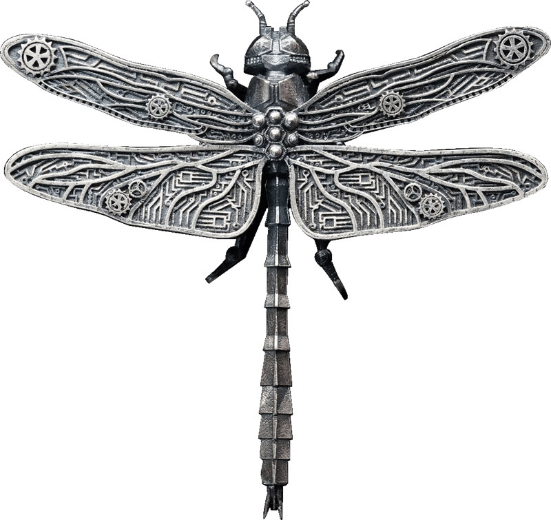 На реверсе 3D – изображение стрекозы. Крылья стрекозы покрыты механическими шестеренками и бионическими нейронами.