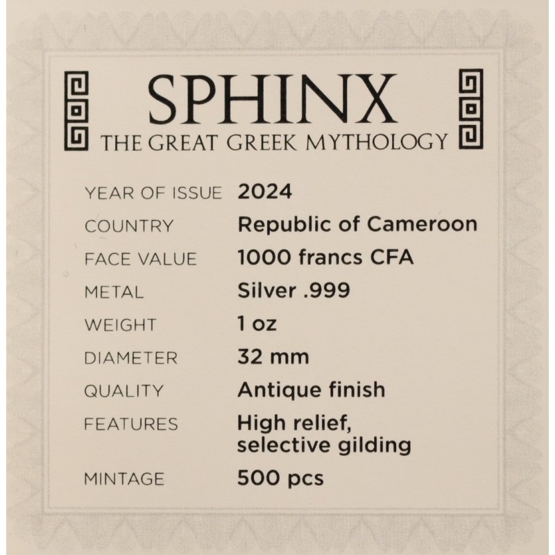 Серебряная монета Камеруна "Великая греческая мифология. Сфинкс" 2024 г.в., 31.1 г серебра (проба 999)