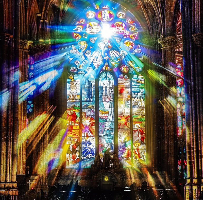 На реверсе изображен свет, проходящий через витражное стекло церкви.