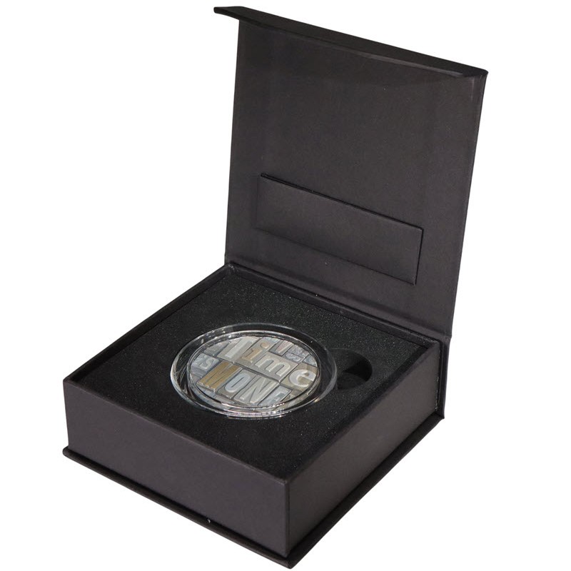 Вы всегда можете заработать больше денег, но нет возможности вернуть потерянное время. Слова Бенджамина Франклина стали принципом и символом современной жизни. Чтобы полностью отразить подлинность этой метафоры, Монетный двор разработал монету весом 2 унции с различными шрифтами с высоким рельефом и специальной отделкой, которая создает впечатление букв пишущей машинки.