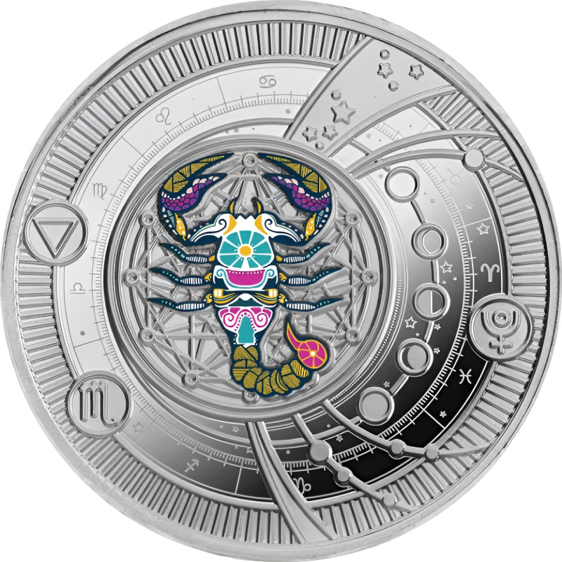 Эта потрясающая серебряная монета-подвеска на шнурке посвящена восьмому астрологическому знаку зодиака - “Скорпион” (Scorpius). Считается, что к нему принадлежат рождённые с 23 октября по 21 ноября. Люди этого знака зодиака обладают природным магнетизмом и сильным характером. Выносливый, сдержанный в словах и эмоциях, Скорпион умеет хранить секреты и ценит верность.