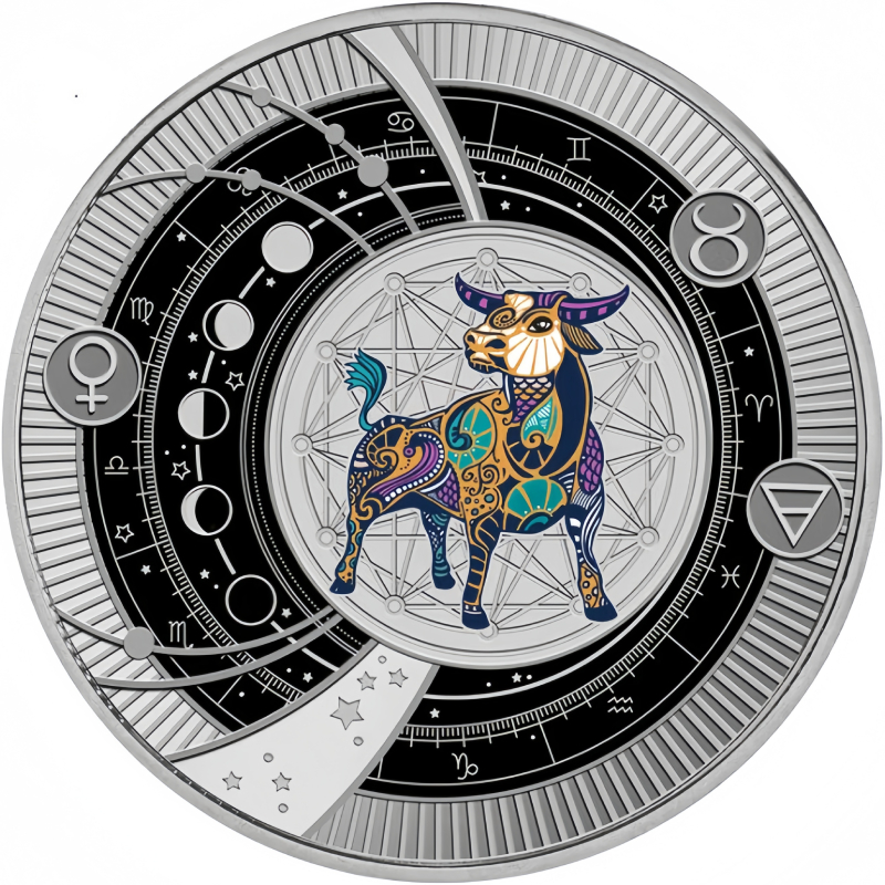 Эта потрясающая серебряная монета-подвеска на шнурке посвящена второму астрологическому знаку зодиака - “Телец” (Taurus). Считается, что к нему принадлежат рождённые с 21 апреля по 20 мая. Астрологи часто описывают рожденных под знаком Тельца как надежных, стабильных и преданных людей. Они ценят дружбу и проявляют невероятную верность близким.