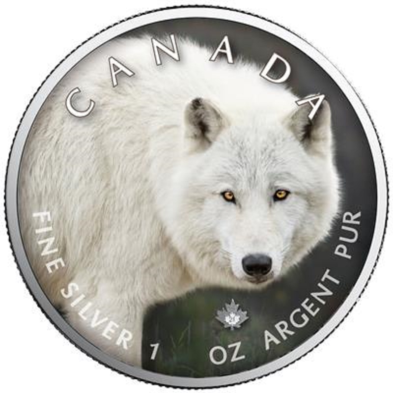 Серебряная монета Кленовый лист Полярный волк в цвете поставляется в защитной капсуле с иллюстрированной карточкой товара
