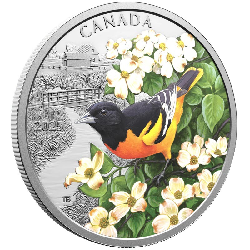 На реверсе изображена балтиморская иволга среди цветков кизила на фоне сельского пейзажа. Вверху надпись: CANADA (страна-эмитент), слева: 2025 (год чеканки), внизу инициалы дизайнера: ТВ (Tony Bianco).