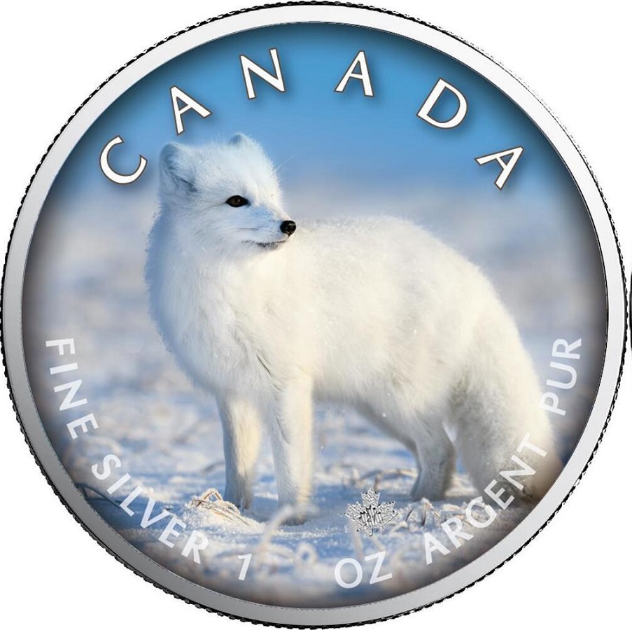 Вторая монета из серии «По следам дикой природы» с цветным изображением песца (полярной лисы).
