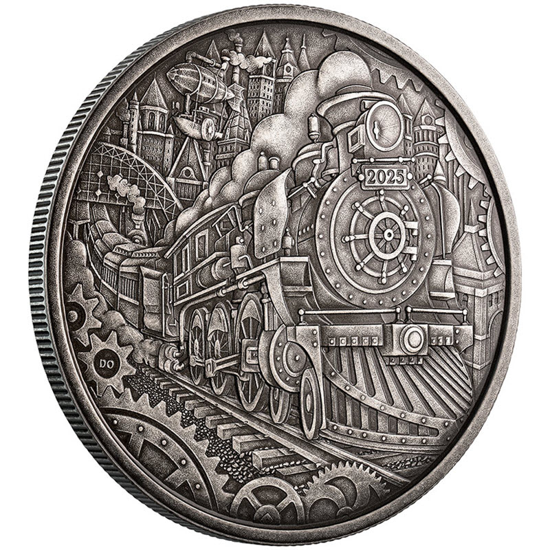 На реверсе изображен мчащийся паровоз на фоне футуристического города. На паровозе надпись: 2025 (год чеканки). Слева у канта внутри шестеренки инициалы дизайнера: DO (David Oram).