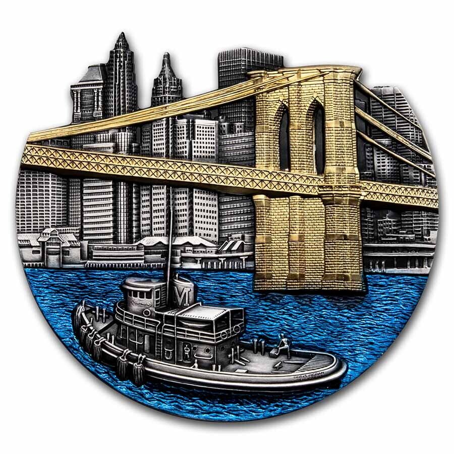 На реверсе монеты изображен прекрасный вид на Бруклинский мост. Фоном для моста служат небоскребы с античной отделкой и замысловатой штамповкой, а их крыши, вырезаны по контуру, повторяют горизонты Нью- Йорка и создают уникальный рельеф монеты. По реке, разделяющей Манхэттен на Квинс и Бруклин, плывет слегка деформированное судно, изогнутое для того, что бы чтобы передать перспективу соответствующую форме монеты. Сам мост отчеканен в высоком рельефе, позолочен 24-каратным золотом, а вода Ист-Ривер сияет тысячей огней, благодаря окраске многоцветной эмалью. Все эти детали воссоздают красивый вид на город начала-середины 20-го века.