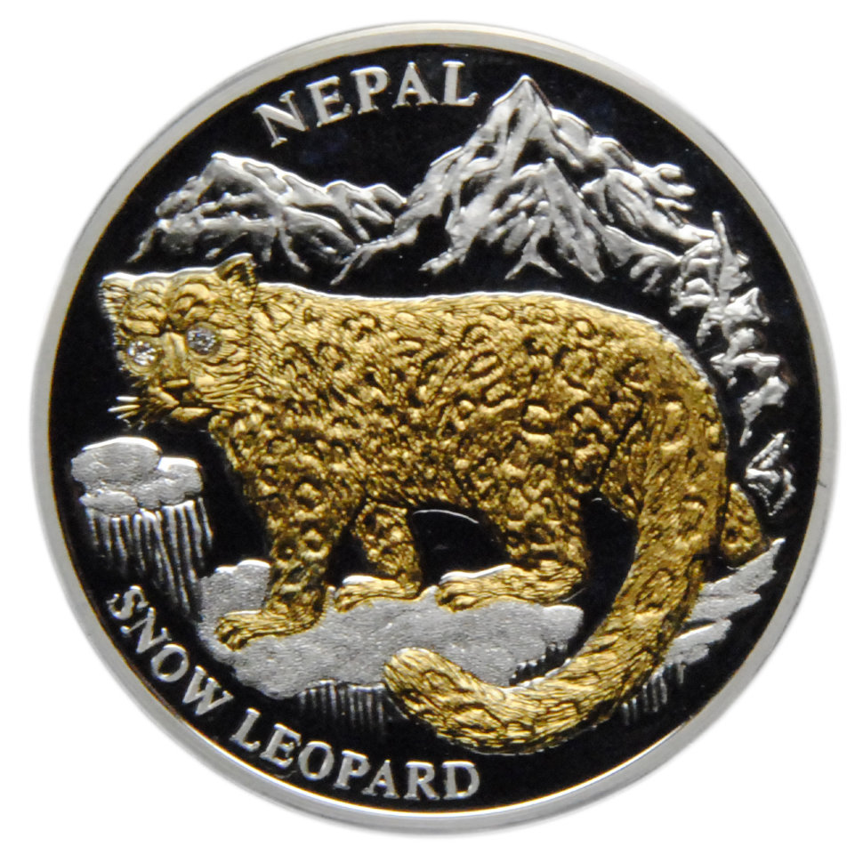 Позолоченная фигура леопарда среди гор. Глаза инкрустированы искусственными бриллиантами. По ободу надписи — NEPAL SNOW LEOPARD