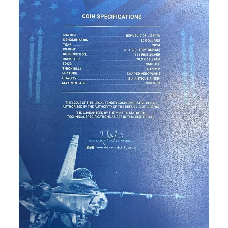 Серебряная монета Либерии "Реактивный истребитель" 2024 г.в., 31.1 г чистого серебра (проба 999)