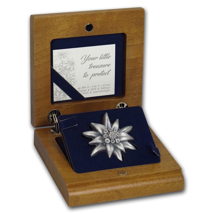 Уникальная монета, выполненная в форме цветка эдельвейса, называемого также, «звездой гор». Эдельвейс считается символом мужества, верности и объединения.